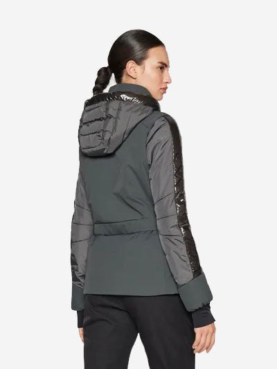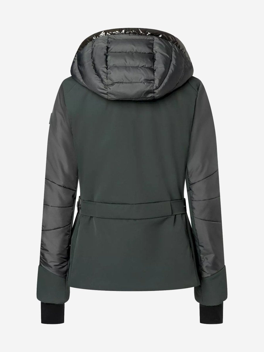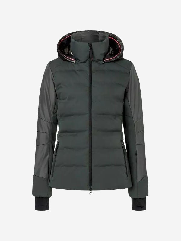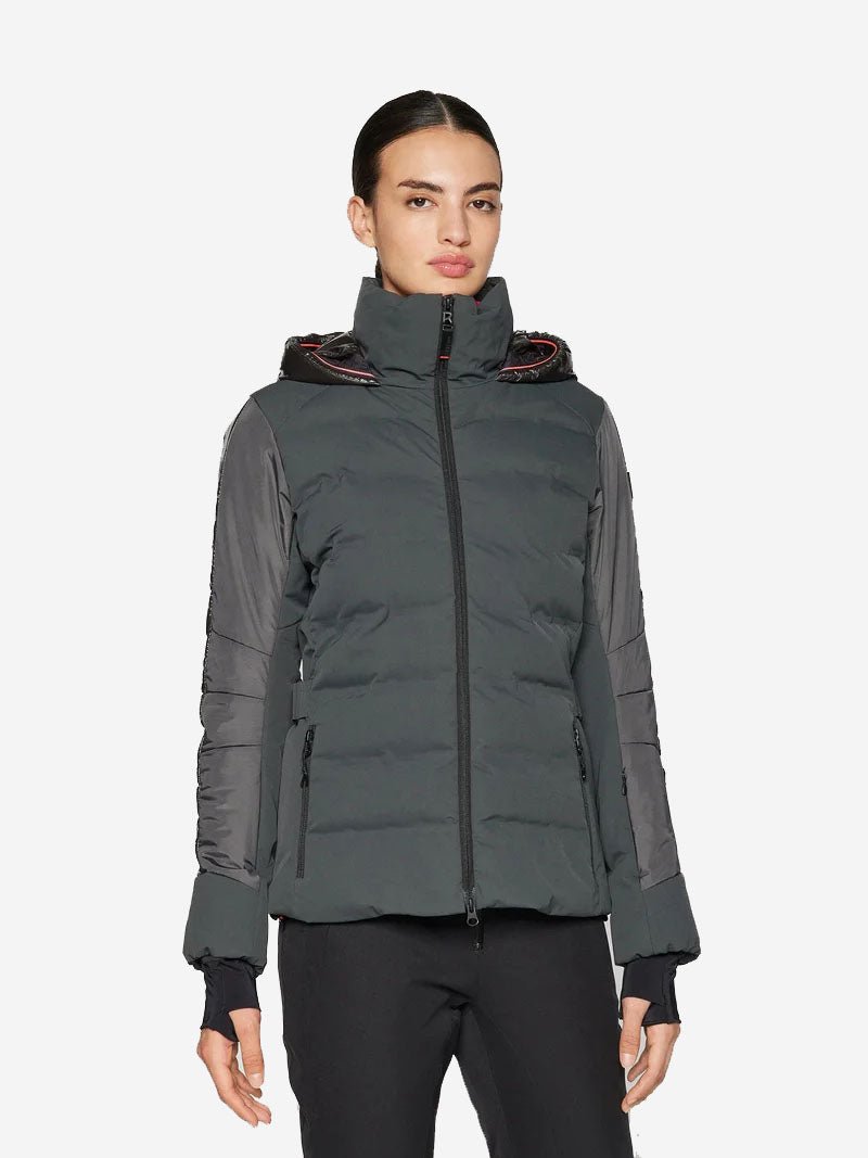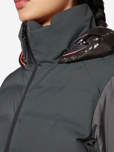 - Practical details: High collar, removable hood, zip pockets, ski pass pocket, elastic snow skirt and cuffs with thumb holes.